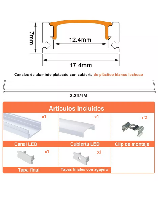 Perfil de aluminio para tira LED | Tramo de 1 metro de canaleta de metal para luz LED
